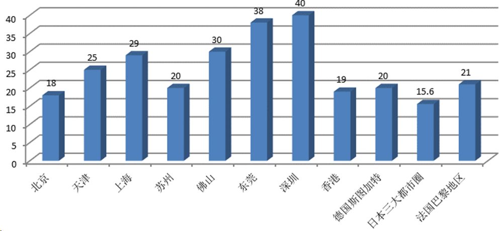 从“鼓励东部地区加快发展”,到“东部地区率先发展”,国家对于东部地区的发展并没有整体规划,更多地体现在支持局部地区发展的政策与规划。由于沿海地区经济比较发达,人口比较密集,开发强度较高(图3),资源环境问题更加突出。国家“十一五”规划纲要提出,东部地区要“提高资源特别是土地、能源利用效率,加强生态环境保护,增强可持续发展能力。”2008年,国家发改委编制了珠江三角洲规划,规划明确:珠江三角洲应率先建立资源节约型和环境友好型社会,率先建立创新型区域,率先建立社会主义和谐社会,率先建立更加开放的经济体系。2010年《全国主体功能区规划》划定的环渤海地区、长江三角洲地区、珠江三角洲地区三个国家层面的优化开发区域,均位于东部沿海地区;2014年《国家新型城镇化规划(2014-2020年)》提出:“东部地区城市群主要分布在优化开发区域,面临水土资源和生态环境压力加大、要素成本快速上升、国际市场竞争加剧等制约,必须加快经济转型升级、空间结构优化、资源永续利用和环境质量提升。”2014年以来国家大力推动的京津冀协同发展则以解决北京“大城市病”为出发点。因此,总体来讲东部地区率先发展是为了解决东部地区的膨胀病。