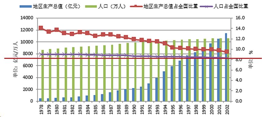 图1 1978-2002年东北的地区生产总值、人口及占全国的比重