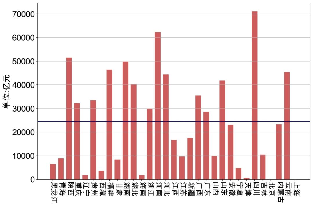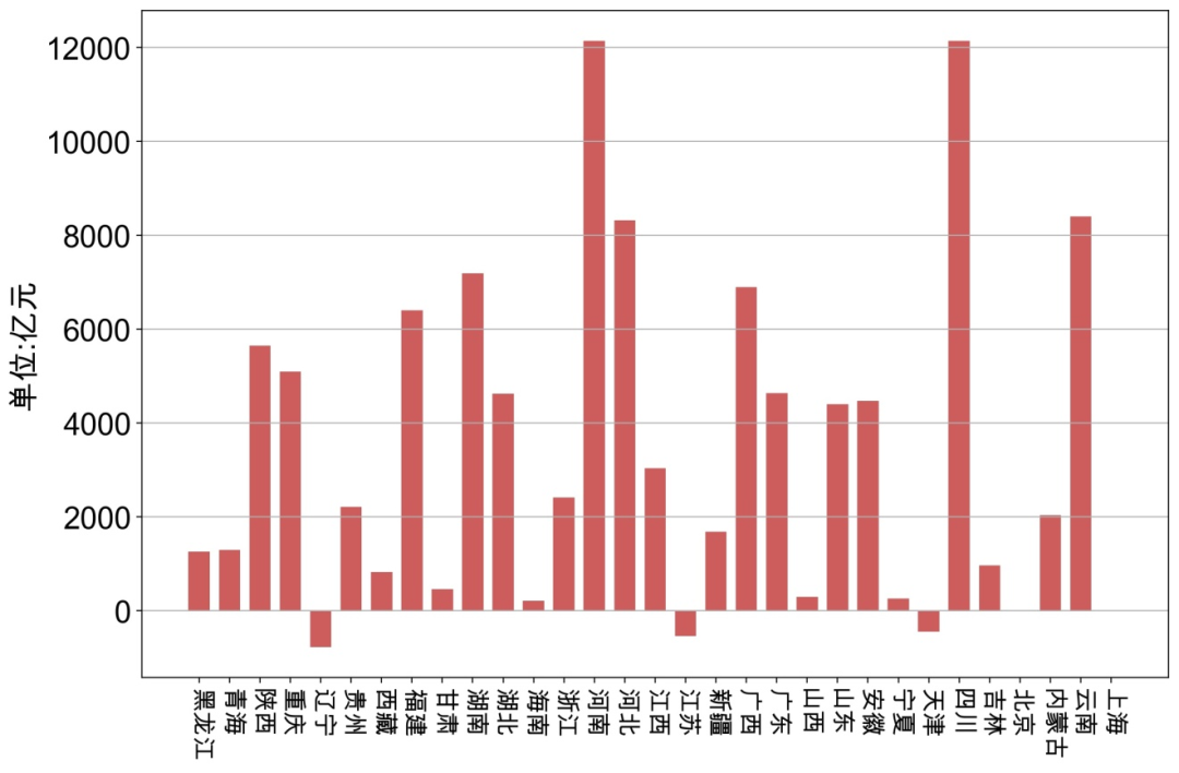 从总量上看,全国隐性债务总量的平均值为24636.35亿元,共有14个省份超过该均值,其中四川、河南、陕西这三省远远超于均值,隐性债务总量甚至超过50000亿元;北京、上海、甘肃、海南、黑龙江、江苏、辽宁、宁夏、青海、天津、西藏这11个省份的隐性债务总量低于1000亿元,其中,北京和上海已实现隐性债务清零目标,天津和海南的隐性债务规模体量较小,分别为629.59亿元和1795.37亿元,未来有望实现清零目标。