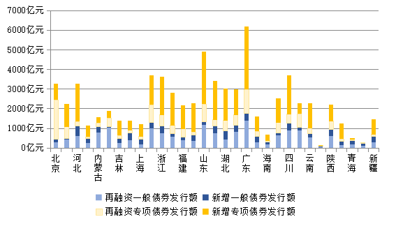 其次是东中部发行占比较高。从下图可以发现,地方债发行规模较高的地区基本上是经济发达地区,由于经济总量大,投资项目和开销较多,地方政府债券发行额总体呈现出“东中部占比较高,西部占比较低”的特点,在经济排名靠后的省份中,发债规模较小。
